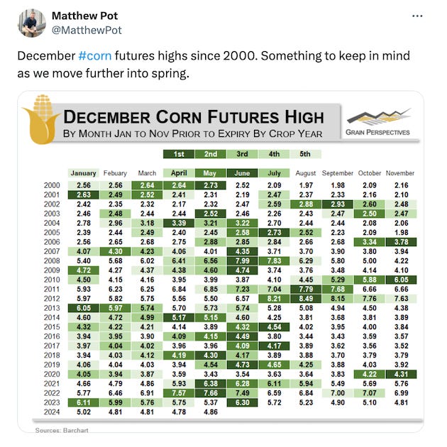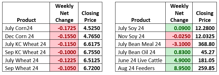 Corn prices did step back this week and while it doesn’t look pretty on a chart it shouldn’t come as a huge shock. May, June, and July are the volatile months and volatility doesn’t mean prices only go up. The weather in July matters most and even though Dec 24 Corn futures closed at $4.765/bu this week, there are more supportive bullish fundamentals then there were at the beginning of the month the last time prices were here.
