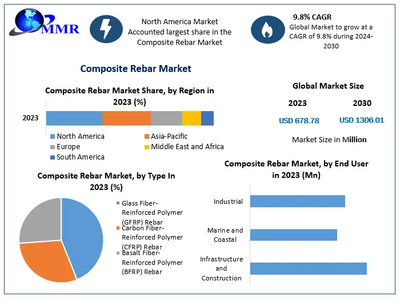Maximize Market Research, a leading Material & Chemical business consultancy and research firm has published a report on the “Composite Rebar Market”. The total market opportunity for Composite Rebar Market was USD 678.78 Mn in 2023 and is expected to grow at a CAGR of 9.8 percent in the forecast period, reaching USD 1306.01 Mn by 2030. As per the report, the global Composite Rebar Market is expected to be dominated by the North America and Asia-Pacific regions to grow at a significant growth rate through the forecast period.