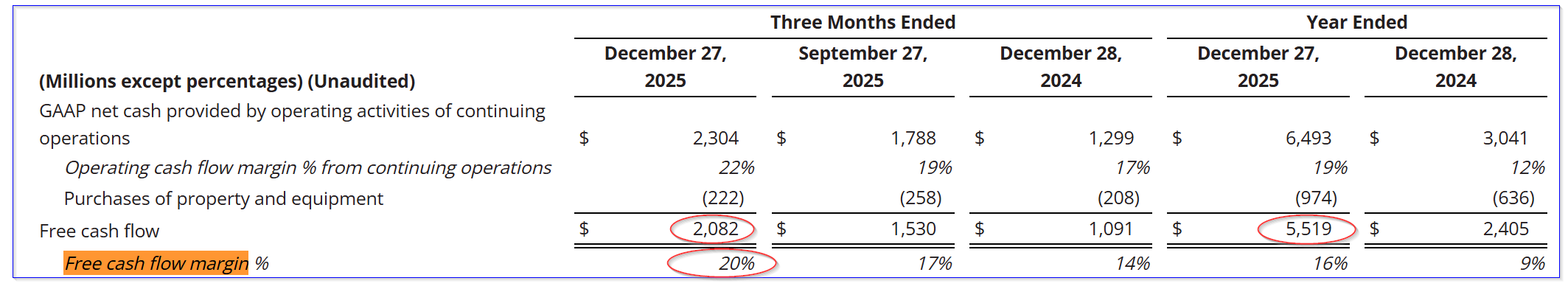 It shows that FCF was $2.082 billion, representing 20% of revenue in Q4, up from 17% last quarter and 14% a year ago. For the full year, it hit 16% vs. 9% last year.