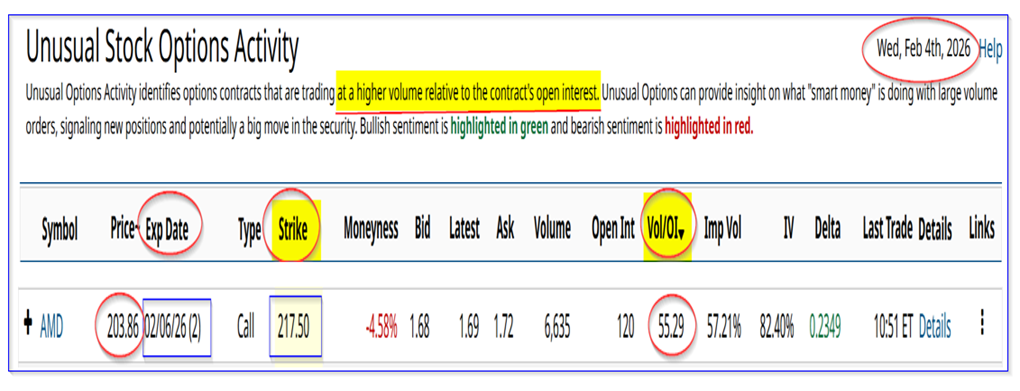 This activity can be seen in today's Barchart Unusual Stock Options Activity report. It shows that over 6,600 call options have traded at the $217.50 strike price for expiry this Friday on Feb. 6, 2026.