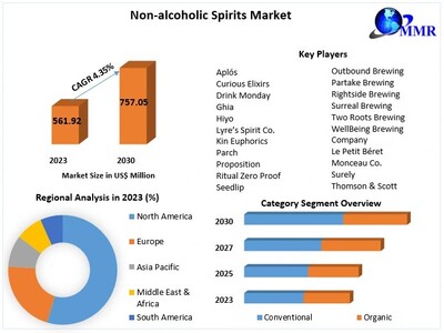 Maximize Market Research a leading Food & Beverages research firm has published a market intelligence report on the Global Non-alcoholic Spirits Market. As per the report, the total market opportunity by 2030 is expected to be USD 757.05 Mn. The total market was valued at USD 561.92 Mn. in 2023 and it is expected to grow at a CAGR of 4.35 percent during the forecast period.