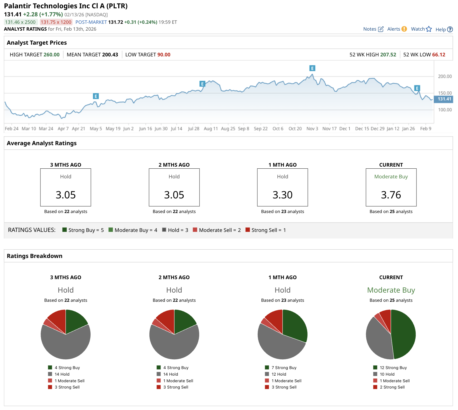 Wall Street remains broadly optimistic on Palantir despite the recent pullback. According to Barchart data, 25 analysts cover the stock, rating it a "Moderate Buy" with an average score of 3.76 (on a 1-5 scale, where 5 is “Strong Buy”). The breakdown shows a shift toward positivity: 12 "Strong Buy" ratings, 10 "Holds," one "Moderate Sell," and two "Strong Sells." This marks a notable upgrade from three months ago, when the consensus was a weaker "Hold" with only four "Strong Buys"—the improved sentiment reflects Palantir's strong Q4 results and 2026 guidance that beat expectations.