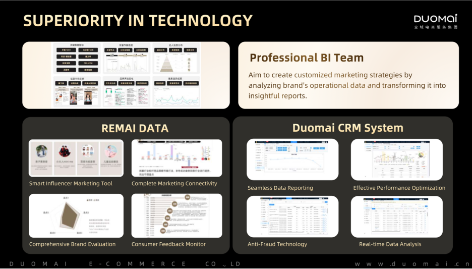 At the heart of DUOMAI's operations is its cutting-edge technical team, offering comprehensive services to brand partners. This includes sophisticated order tracking systems, robust fraud prevention mechanisms, and extensive technical support. The BI team at DUOMAI delves deep into brand insights, utilizing proprietary big data analysis tools, REMAI DATA and CRM data systems, for enhanced marketing efforts. These tools provide invaluable insights for real-time monitoring and analysis of creator content, aligning with brand standards and mitigating fraudulent activities effectively.