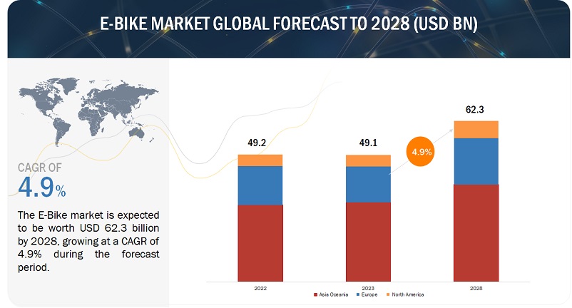 The global E-Bike market is projected to grow from USD 49.1 billion in 2023 to USD 62.3 billion by 2028 at a CAGR of 4.9%. The e-bike industry has declined in 2023 in some regions due to economic uncertainty, supply chain disruptions, and price competition due to intense competition. However, these are temporary challenges, and the market would remain positive in the long-term outlook. Though the e-bike market in other regions hasn’t shown any decline, the market has shown steady growth. Reasons such as growing environmental concerns, government support such as dedicated lanes or incentives, technological advancements, and changing consumer preferences would drive the market in the long run. Increasing inclination towards multi-modal transportation would also drive the market for e-bikes in the coming years.