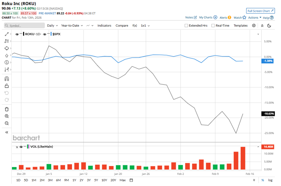 The sharp move reflected a wave of renewed confidence in the company’s turnaround story. But step back from the one-day rally, and the picture looks less celebratory. Even after the post-earnings surge, Roku stock is still down 17.45% in 2026, a notable laggard compared to the broader S&P 500 Index ($SPX), which has declined only marginally this year.