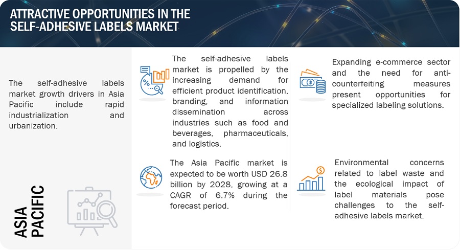 The self-adhesive labels market is projected to grow from USD 53.2 billion in 2023 to USD 69.2 billion by 2028 at a CAGR of 5.4%. The self-adhesive labels market is influenced by growing demand from packaging companies. The growth of the packaging industry will have a positive impact on the self-adhesive labels market as consumers give preference to packaged branded food as compared to ones that are sold unbranded. Opportunities arise from growing economies. The markets for self-adhesive labels in developed economies such as North America and Europe have become saturated. However, developing markets such as Brazil, India, and China are in a growth stage.