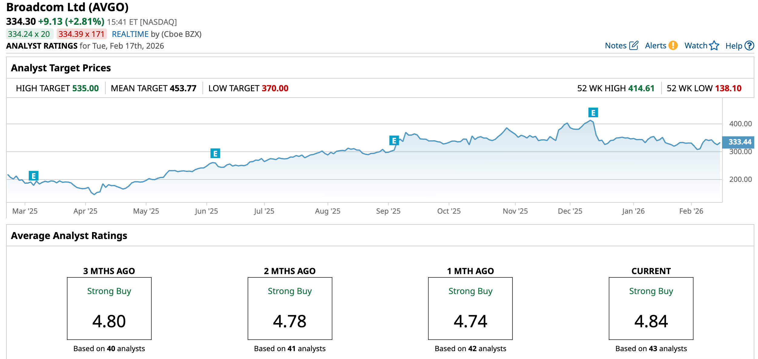 Wall Street currently assigns AVGO stock a “Strong Buy” overall rating. Among 43 analysts covering the stock, 38 recommend “Strong Buy,” three suggest “Moderate Buy,” and two call for “Hold.”