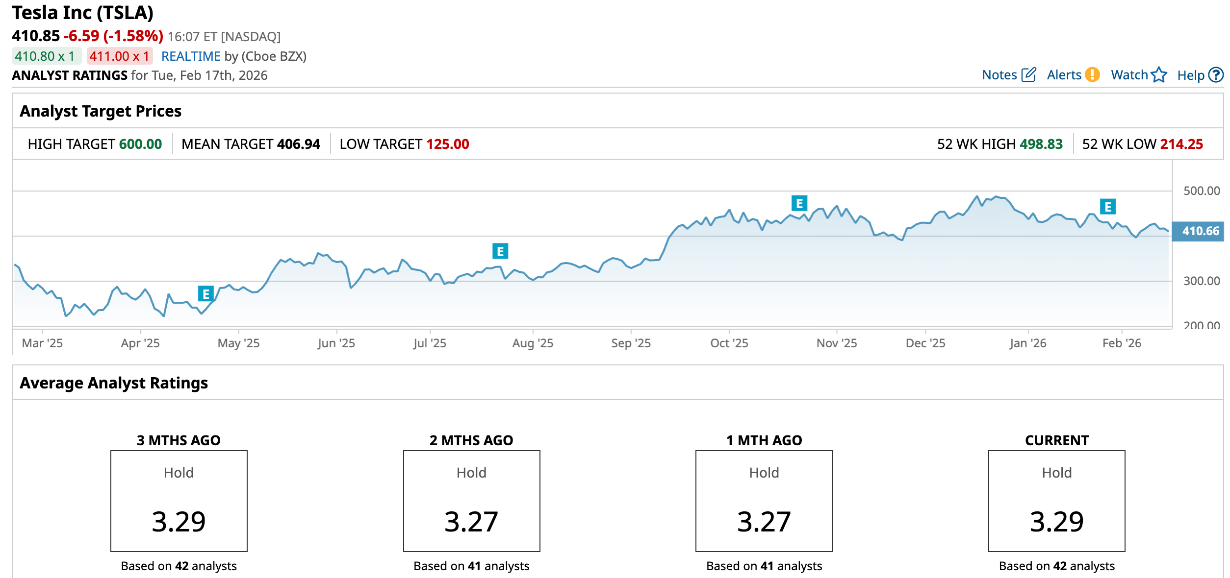 Out of the 42 analysts covering Tesla stock, 14 recommend “Strong Buy”, two recommend “Moderate Buy”, 17 recommend “Hold”, and nine recommend “Strong Sell”. The average TSLA stock price target is $406.94, below the current price of $410.85.