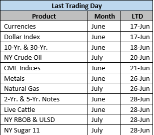 Below are the contracts which are entering First Notice or Last Trading Day for the upcoming month. Be advised, for contracts that are deliverable, it is requested that all LONG positions be exited two days prior to First Notice and ALL SHORT positions be exited the day prior to Last Trading Day. If you have any questions please contact the Trade Desk or your broker.