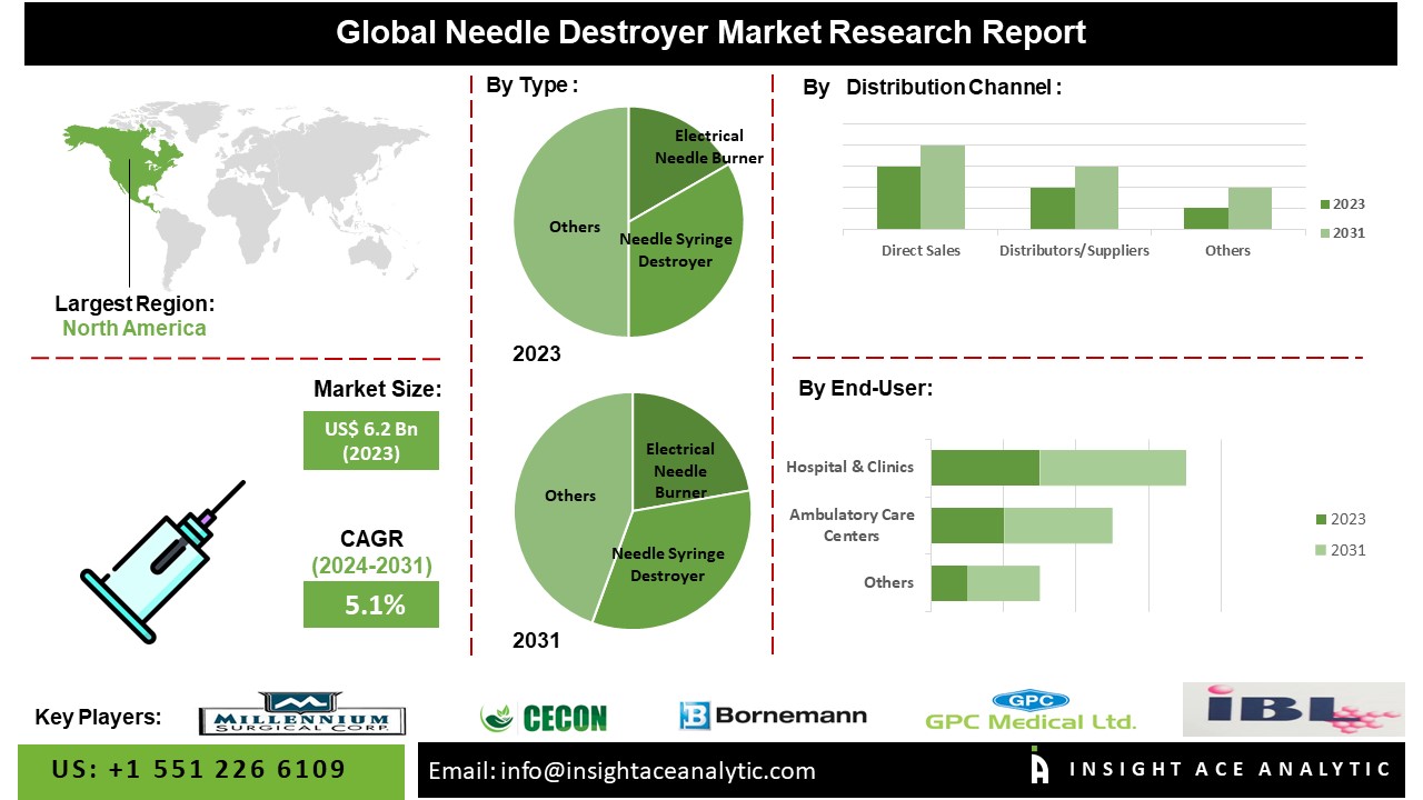 InsightAce Analytic Pvt. Ltd. announces the release of a market assessment report on the "Global Needle Destroyer Market- (By Type (Electrical Needle Burner, Needle Syringe Destroyer), By Distribution Channel (Direct Sales, Distributors/Suppliers, Online), End User (Hospital & Clinics, Ambulatory Care Centers, Others)), By Region, Trends, Industry Competition Analysis, Revenue and Forecast To 2031."