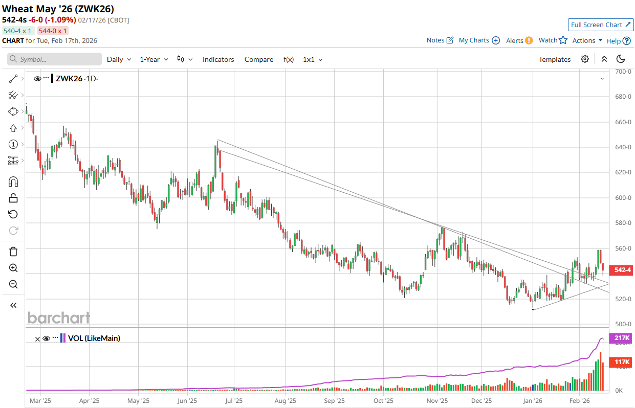 - Wheat pulled back from a managed fund type of short-covering last week, both in spreads and in flat price today. The volume chasing it lower was less than the volume that had chased it higher in both markets. Open interest is down therefore it suggests to me that it was merely a short covering rally that gave money managers the opportunity to re-short the market on a rally. This type of action has been commonplace for Chicago wheat going back over 3 years as managed funds have been net short consecutively for three plus years according to CFTC weekly data. I believe that weekly pace over three years to be a record. Good moisture on the Southern plains also pressured recent longs while prospects of better Russian production hit the wires along with Indian exports. After a slow start, Russian wheat exports have run above year ago levels since November. Additionally, Sovecon raised their estimate of the coming Russian 2026/27 wheat crop to 85.9 MMT from 83.8 MMT. India approved 2.5 M t of wheat exports and 0.5 M t of wheat product exports, adding new supply to global markets. Managed funds were net sellers of 3.9k contracts in CBOT wheat (net short 86k) and 10.7k KCBT wheat (net short 19k) while being small net buyers of 1.9k contracts in MPLS wheat (net short 19k). This is setting up as rinse and repeat in wheat in my opinion.