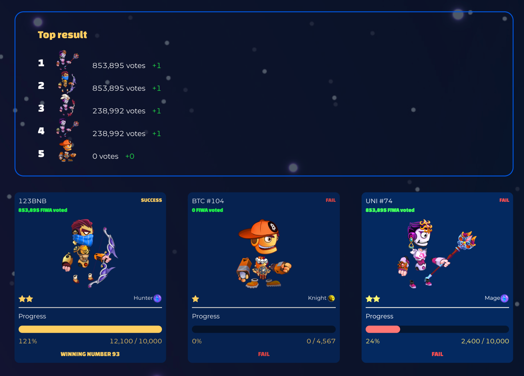 This feature allows players to propose their NFTs for sale. With the technology of blockchain integrated into the game, other players will be able to vote for the NFTs they wish to see on sale in the marketplace. As the 10 most voted NFTs are put on sale, each player will then have a chance to bring home one of the NFTs for just 2 USDT. The lucky winner will be randomly drawn with a highly reliable blockchain technology which is Chainlink VRF, a function that generates random and unpredictable numbers, so the result will be all transparent.