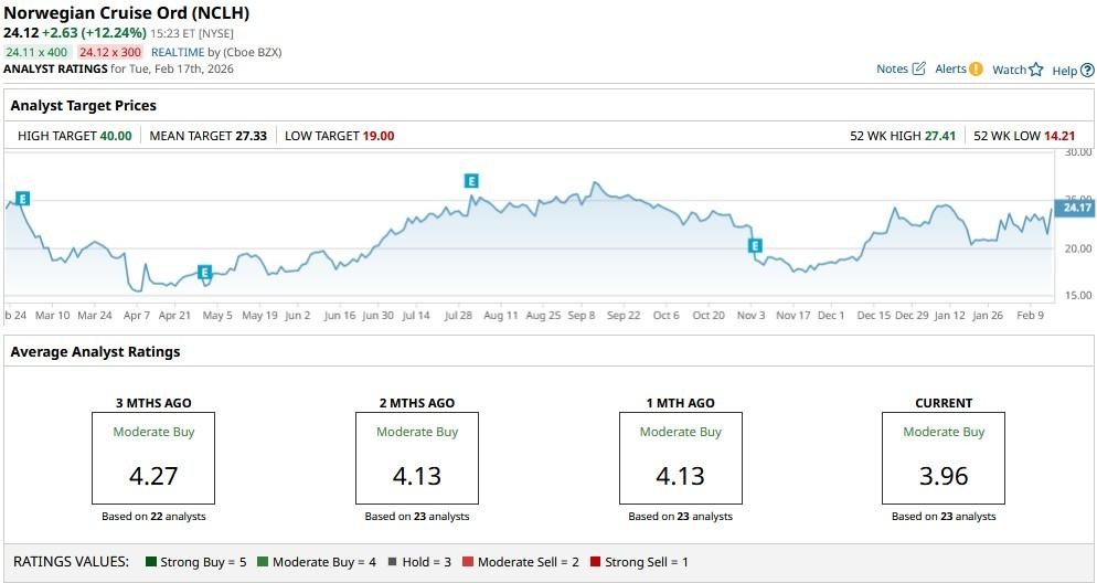 The consensus rating on Norwegian Cruise Line sits at a “Moderate Buy” rating currently, with the mean target of roughly $27 indicating potential upside of 13% from here.
