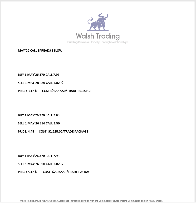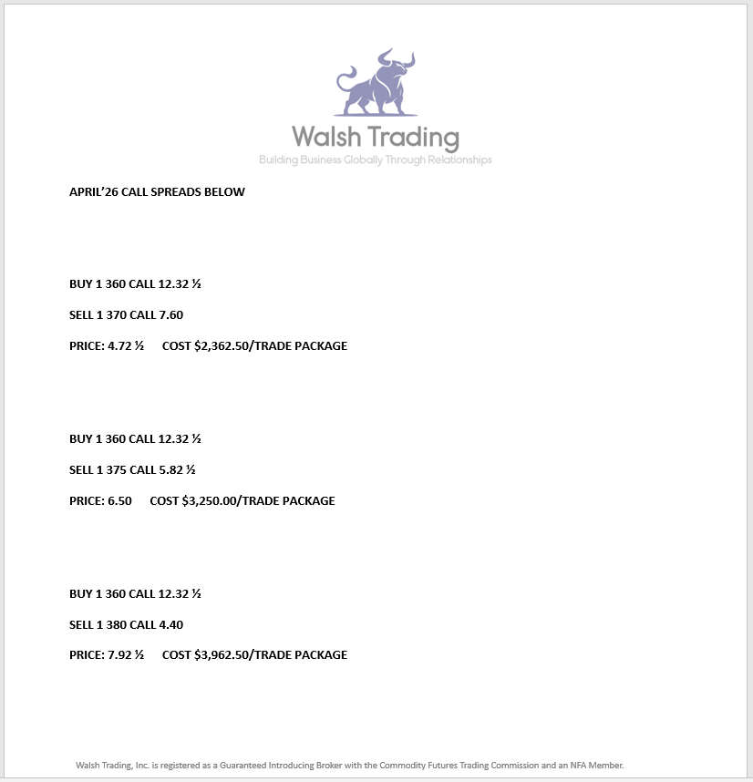 The Grain Markets were mixed today, with only the Beans closing higher, and the Corn and Wheat sinking lower. May'26 Soybeans were ¼ of a cent higher today and settled at 1048 ¾. Today's high was 1053 ¾ and the 1-month high is 1156 ¼. Today's low was 1141 and the 1-month low is 1141. Since 1/16 May'26 Soybeans are 80 cents higher or almost 7 ½%. May'26 Corn followed the Wheat lower today. May'26 Corn was 6 ¼ cents lower today and settled at 435 ¾. Today's high was 441 ¼ and the 1-month high is 443 ¾. Today's low was 435 ¼ and the 1-month low is 429 ½. Since 1/16 May'26 Corn is 3 ¾ cents higher or almost 1%. The Wheat Market took a dive today. May'26 Wheat was 6 cents lower today and settled at 542 ½. Today's high was 548 and the 1-month high is 558 ¾. Today's low was 538 ¾ and the 1-month low is 518 ½. Since 1/16 May'26 Wheat is 13 ¾ cents higher or more than 2 ½%. The Soybean Oil still looks great to me, but the Soybeans look overvalued. The NOPA crush report was released this morning, and it was above estimates. That, along with the Soybean Oil kept the Beans positive on the day. I think the Beans can break sometime soon, and I like the July'26 1050 Puts, and they settled at 6 7/8 today. The Brazilian crop will be huge, and the games with China maybe buying more will be over sooner than later. Unless there is a planting issue here this spring, I feel we can see Soybean prices start to decline soon. If you have not hedged your Soybeans yet, I recommend doing now, and an OTC Structured Produce could be perfect right now, as it will allow you to sell above current price levels. If you have any interest in hedging now, or would like more information on the OTC Products, give me a call and I can have something designed specifically for you. The Corn Market is a contract I do not see moving much anytime soon. I like selling the July'26 440 Straddle and collecting 38 ¼ cents. The Wheat Market was lower today after Russian Ports were bombed by Ukraine last night, so that Market can move in any direction at any time. I am staying away from the Wheat but would rather buy it than sell it. The Soybean Oil I feel is the trade to have on, and today the May'26 futures traded to within 0.25 of the contract high of 58.34. I have also increased my Soybean Oil Target Level to 65.00. The Soybean Oil Future Spreads and Option Spreads have been working very well, and I put more of them on today. The August'26/December'26 Future and Option Spreads are ready to take off again. Give me a call if you are interested, and I will show what I am thinking. This year could be one to remember, with the way several of these commodity contracts are lining up. Call me and I will show you how easy it is to open an account and walk you through the process. I look forward to hearing from you. Have a great night.