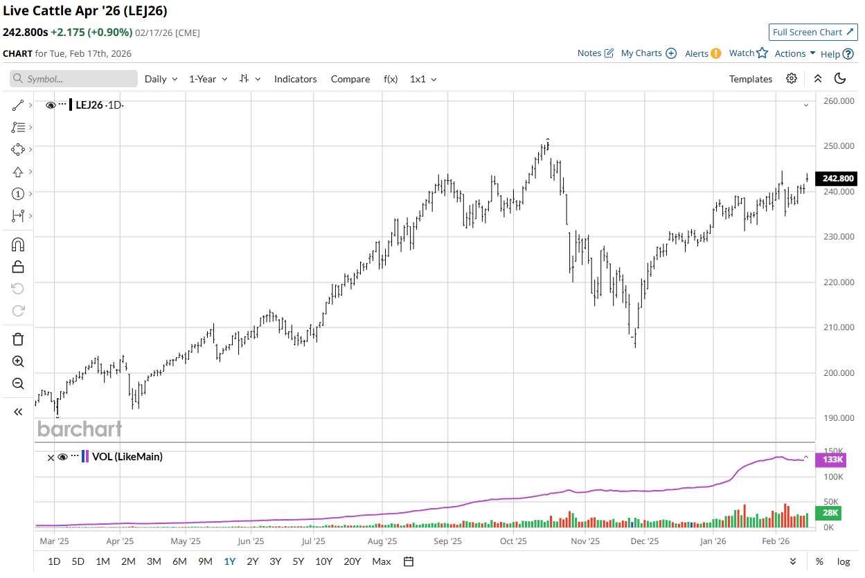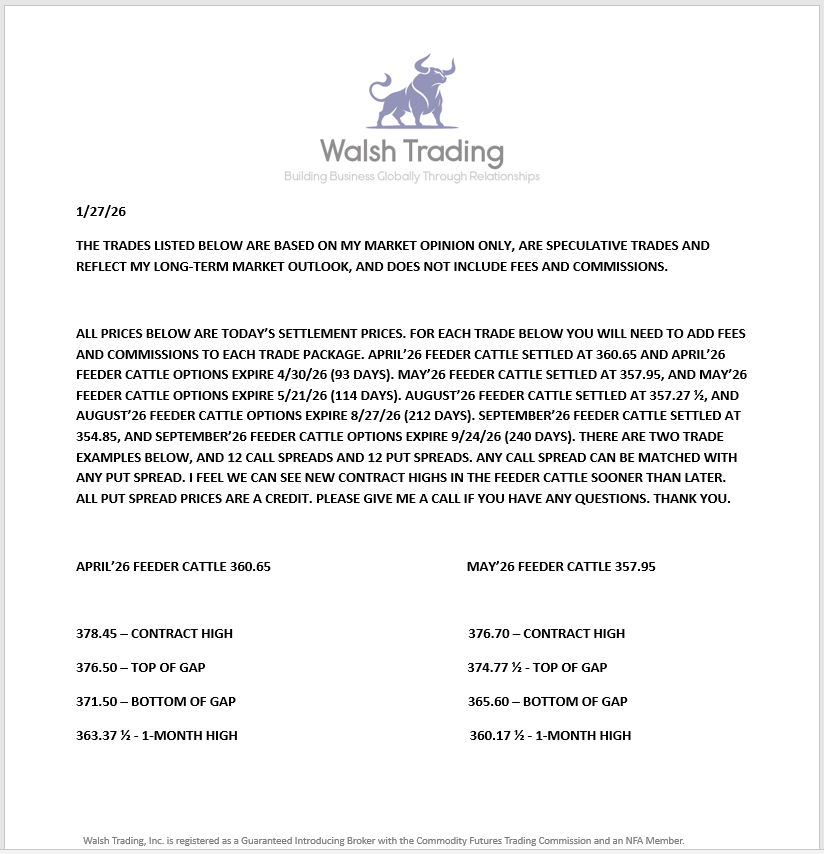 The Cattle Markets charged ahead again today. April'26 Live Cattle were 2.17 ½ higher today and settled at 242.80. Today's high was 244.00 and the 1-month high is 244.57 ½. Today's low was 242.10 and the 1-month low is 232.65. Since 1/16 April'26 Live Cattle are 8.82 ½ higher or almost 4%. The March'26 Feeders were almost 5 bucks higher today. The March'26 Feeder Cattle were 4.82 ½ higher today and settled at 370.97 ½. Today's high was 372.25 and the 1-month high is 373.60. Today's low was 368.92 ½ and the 1-month low is 354.55. Since 1/16 March'26 Feeder Cattle are 14.52 ½ higher or more than 4%. The Hogs traded more than a dollar higher today. April'26 Lean Hogs were 1.02 ½ higher today and settled at 92.30. Today's high was 93.00 and the 1-month high is 99.80. Today's low was 91.50 and the 1-month low is 91.12 ½. Since 1/16 April'26 Lean Hogs are 2.90 higher or more than 3%. Having any fun yet? The cash market was very strong on Friday after the close, and today I heard that the cash market traded 250.00 in Iowa, but waiting for confirmation. The Cattle Markets are on fire, and I feel there is still room to run higher. The Gap above in the April'26 Fats starts at 246.25 and the top of the gap is 4.00 higher at 250.25. The April'26 Fats closed a couple bucks+ higher today and traded to within 57 ½ cents of the 1-month high of 244.57 ½ on the highs today. Today's settlement price of 242.80 is 1.77 ½ below the 1-month high, 3.45 below the bottom of the Gap above, 7.45 below the top of the Gap above, and 8.12 ½ below the contract high. The Gap in the March'26 Feeders starts at 370.60 and settled above that today. The top of the Gap is 6.10 higher from the start at 376.70. The March'26 Feeders closed almost 5.00 higher today, and above the bottom of the Gap, which I think is important. Today's settlement in the March'26 Feeders is 2.62 ½ below the 1-month high, 5.72 ½ below the top of the gap, and 7.62 ½ below the contract high. I still think we can see the Gaps above get filled in the Fats and the Feeders, challenge contract highs, trade through them, and then repeatedly establish new contract highs for a while. There will be pullbacks in the Market, if new highs are made, but I am not looking for a correction yet. Unless something unforeseen happens (which is always possible) I think we can see higher prices into June and then reevaluate everything. I still recommend putting on Bullish Option trades, that have limited and defined risk. If you have not been a part of the upside in the Cattle Markets yet, I still feel there is time, and a $50.00 rally in the Feeders from today's settlement price looks possible to me. I am structuring new trades now, so give me a call if you are interested.