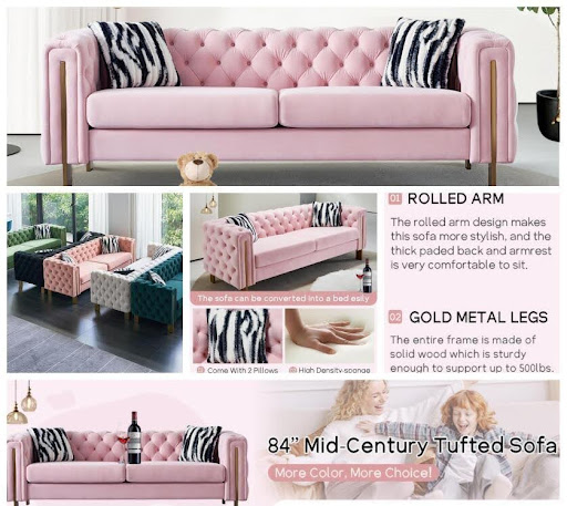 Here they have the Chesterfield Modern Tufted Velvet Sofa, a standout item that will surely catch eyes. With its luxurious velvet button tufting, elegant gold metal legs, and high-quality multi-density foam, this sofa offers both style and comfort. Built upon a sturdy frame, it guarantees durability and long-lasting use.