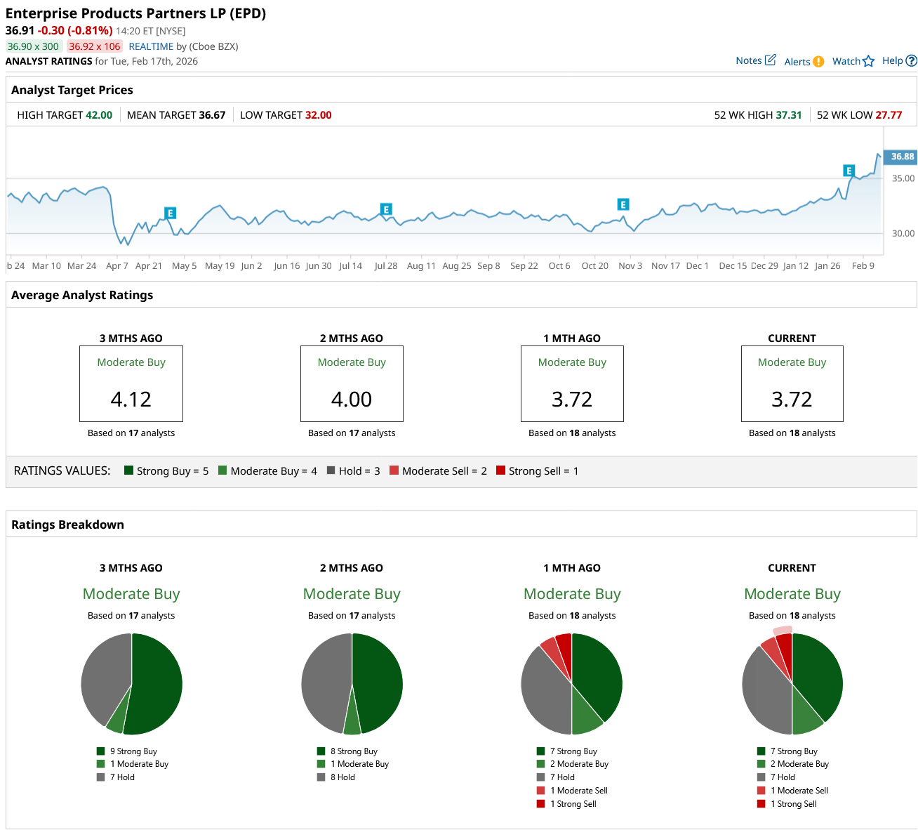 Overall, on Wall Street, EPD stock is a “Moderate Buy.” Of the 18 analysts covering the stock, seven rate it a “Strong Buy,” two rate it a “Moderate Buy,” seven say it is a “Hold,” one rates it a “Moderate Sell,” and one says it is a “Strong Sell.” EPS stock has also surpassed its average target price of $36.67. However, its high price target of $42 implies the stock can climb 13% over the next 12 months.
