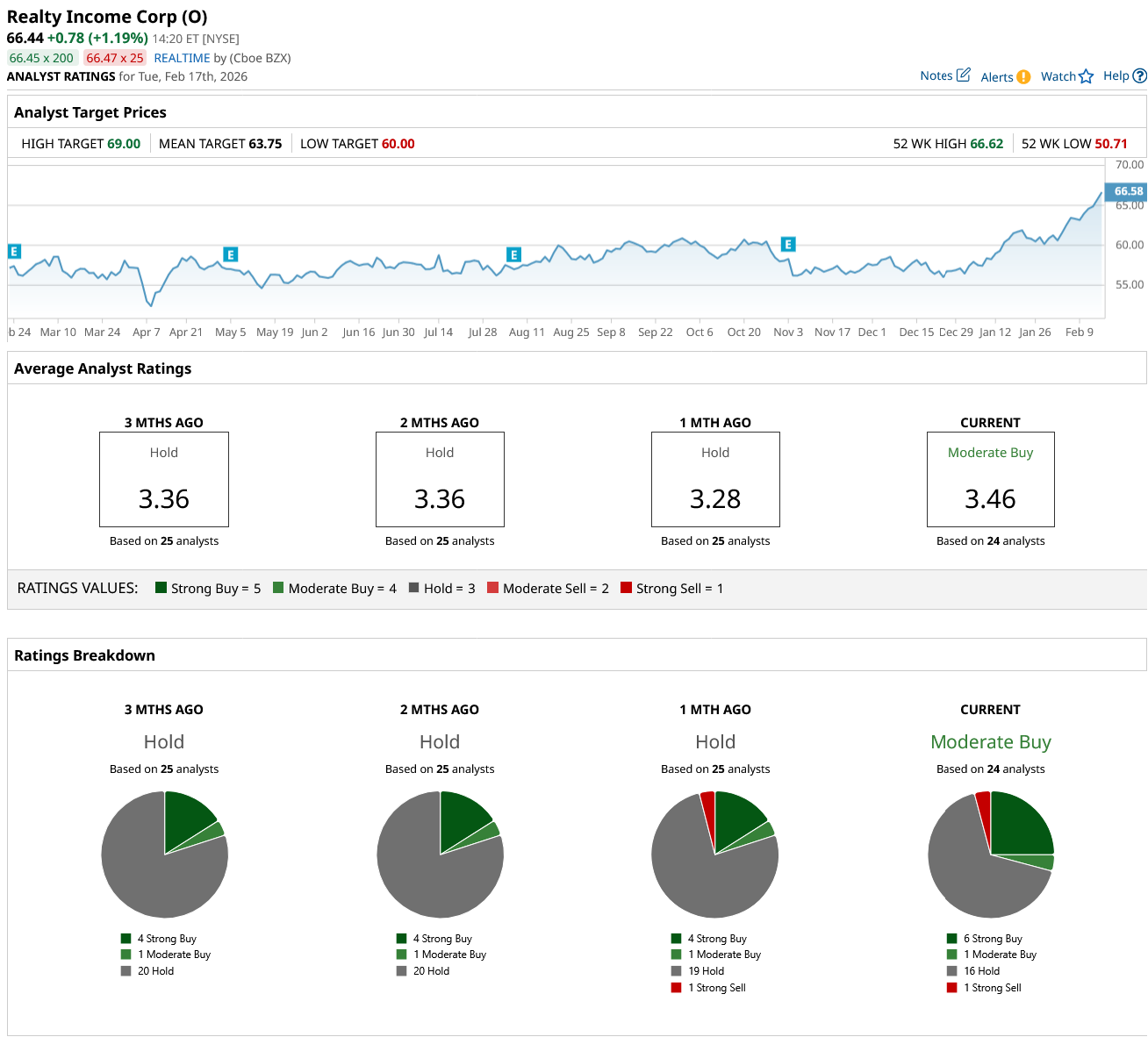 Overall, on Wall Street, O stock is a “Moderate Buy.” Of the 24 analysts covering the stock, six rate it a “Strong Buy,” one says it is a “Moderate Buy,” 16 rate it a “Hold,” and one says it is a “Strong Sell.” Realty Income stock is trading above its average target price of $63.75. However, its high price target of $69 is 4% higher than current levels.