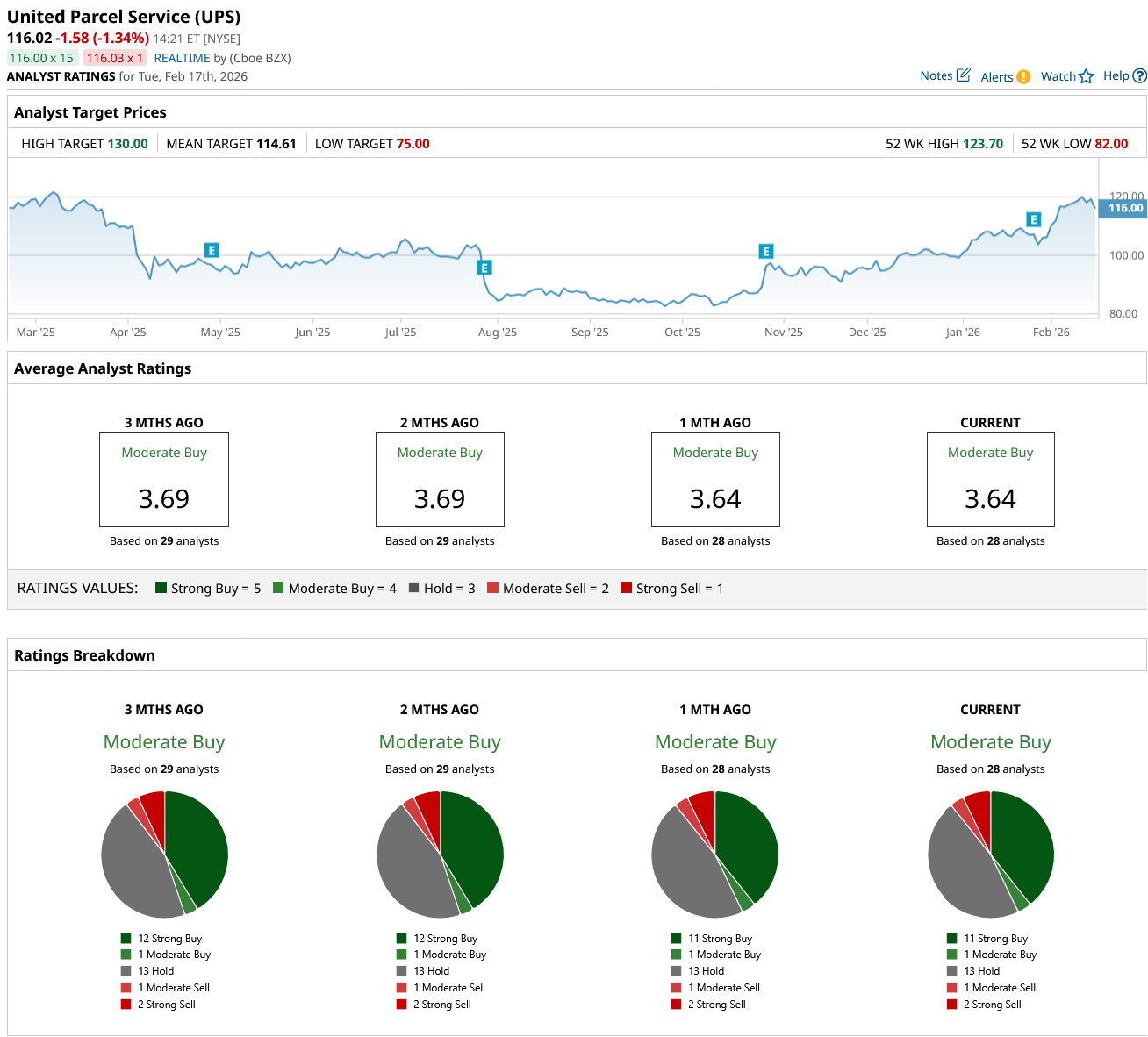Overall, on Wall Street, UPS stock is a “Moderate Buy.” Of the 28 analysts covering the stock, 11 rate it a “Strong Buy,” one rates it a “Moderate Buy,” 13 rate it a “Hold,” one says it is a “Moderate Sell,” and two rate it a “Strong Sell.” UPS is trading higher than its average target price of $114.61. However, its high price target of $130 implies the stock can climb 9% over the next 12 months.