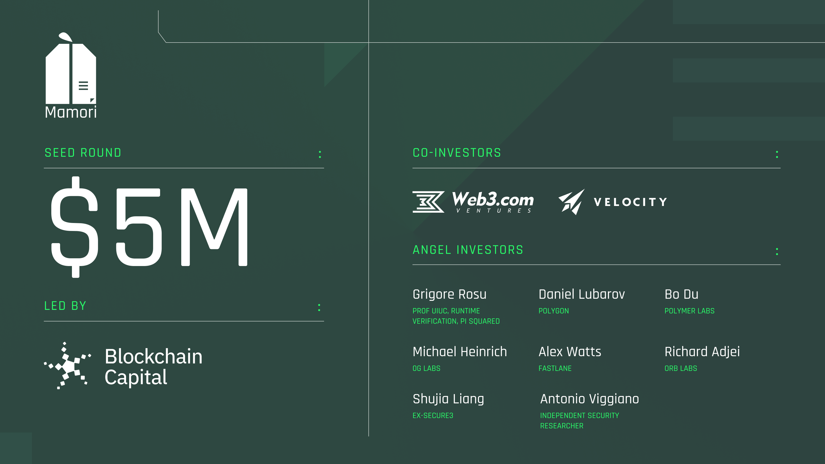 Angel investors include Grigore Rosu, Daniel Lubarov, Alex Watts, Bo Du, Shujia Liang, Micheal Heinrich, Richard Adjei and Antonio Viggiano.