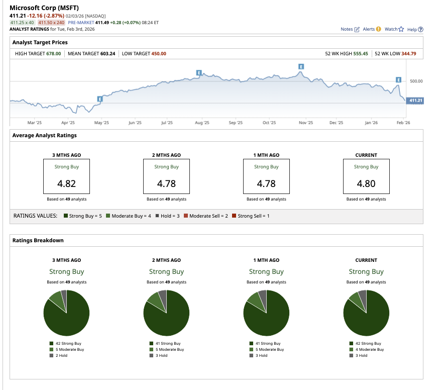 Overall, Wall Street is optimistic about MSFT stock, assigning it a consensus “Strong Buy” rating. Of the 49 analysts covering MSFT stock, 42 have a “Strong Buy” recommendation, four suggest a “Moderate Buy,” and three rate it a “Hold.” The average price target of $603.24 implies the stock has 47% potential upside from current levels. The Street-high price target of $678 suggests the stock could rally as much as 65% over the next 12 months.