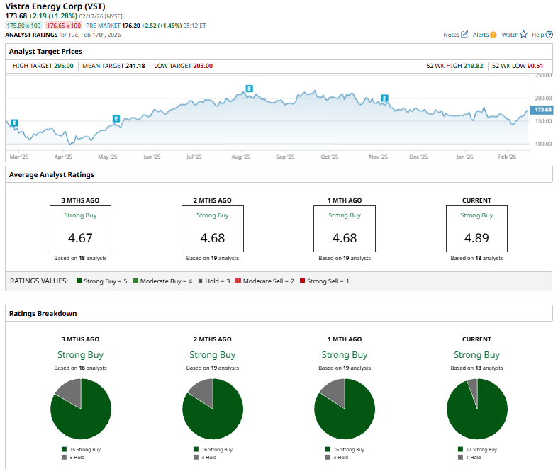 The mean price target of $241.18 represents a premium of 38.9% to VST's current price. The Street-high price target of $295 suggests a 69.9% potential upside.