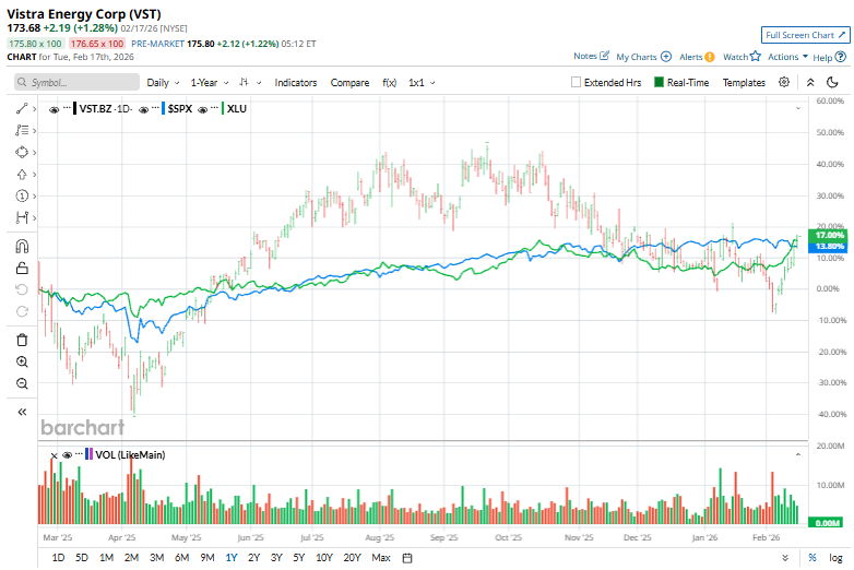 Looking closer, shares of Vistra have underperformed the State Street Utilities Select Sector SPDR Fund's (XLU) 17.3% rise over the past 52 weeks and 8.6% return in 2026.