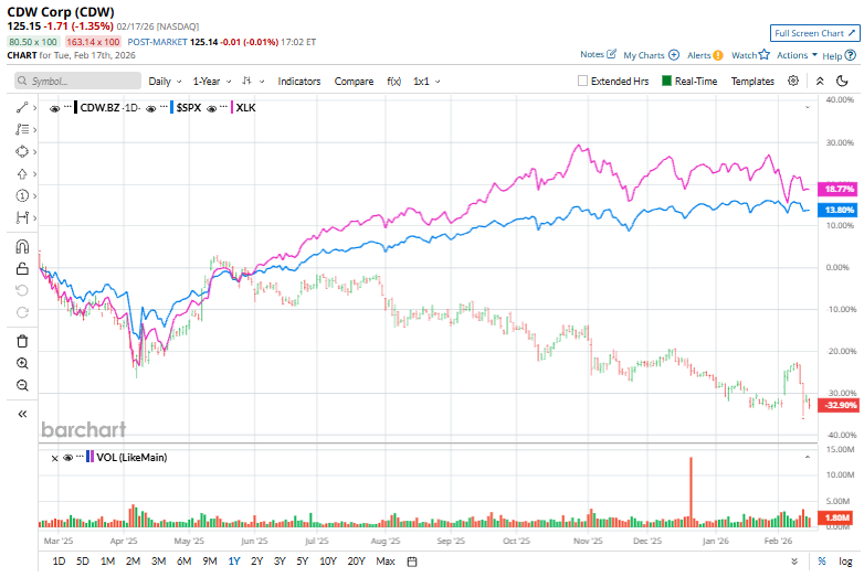 Shares of the tech company have lagged behind the broader market over the past 52 weeks. CDW stock has slumped 33.9% over this time frame, while the broader S&P 500 Index ($SPX) has risen 11.9%. Moreover, shares of CDW have dropped 8.1% on a YTD basis, compared to SPX's marginal fall.