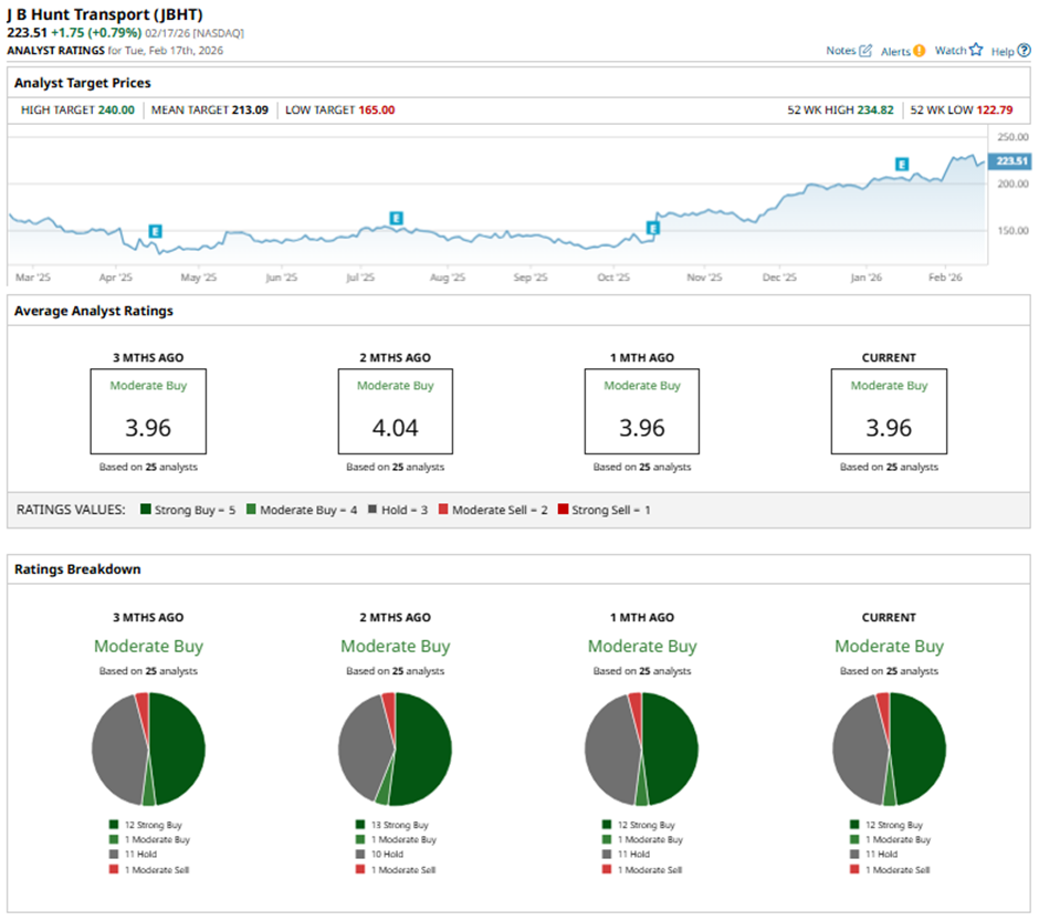 Despite reporting better-than-expected Q4 2025 EPS of $1.90 on Jan. 15, shares of JBHT fell over 1% the next day as the company reported revenue of $3.10 billion down 2% year-over-year and below Street forecasts. Investor sentiment was further pressured by demand softness across core segments, including a 3% revenue decline in Intermodal, a 7% drop in ICS load volume, and a sharp 10% revenue fall in Final Mile Services.