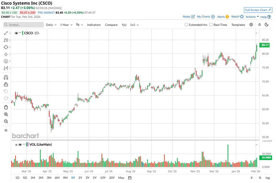 Over the past 52 weeks, Cisco’s shares skyrocketed almost 33%, while the last six months alone produced a 19.1% surge. Momentum intensified further, with the stock adding another 7.27% in just the past month.