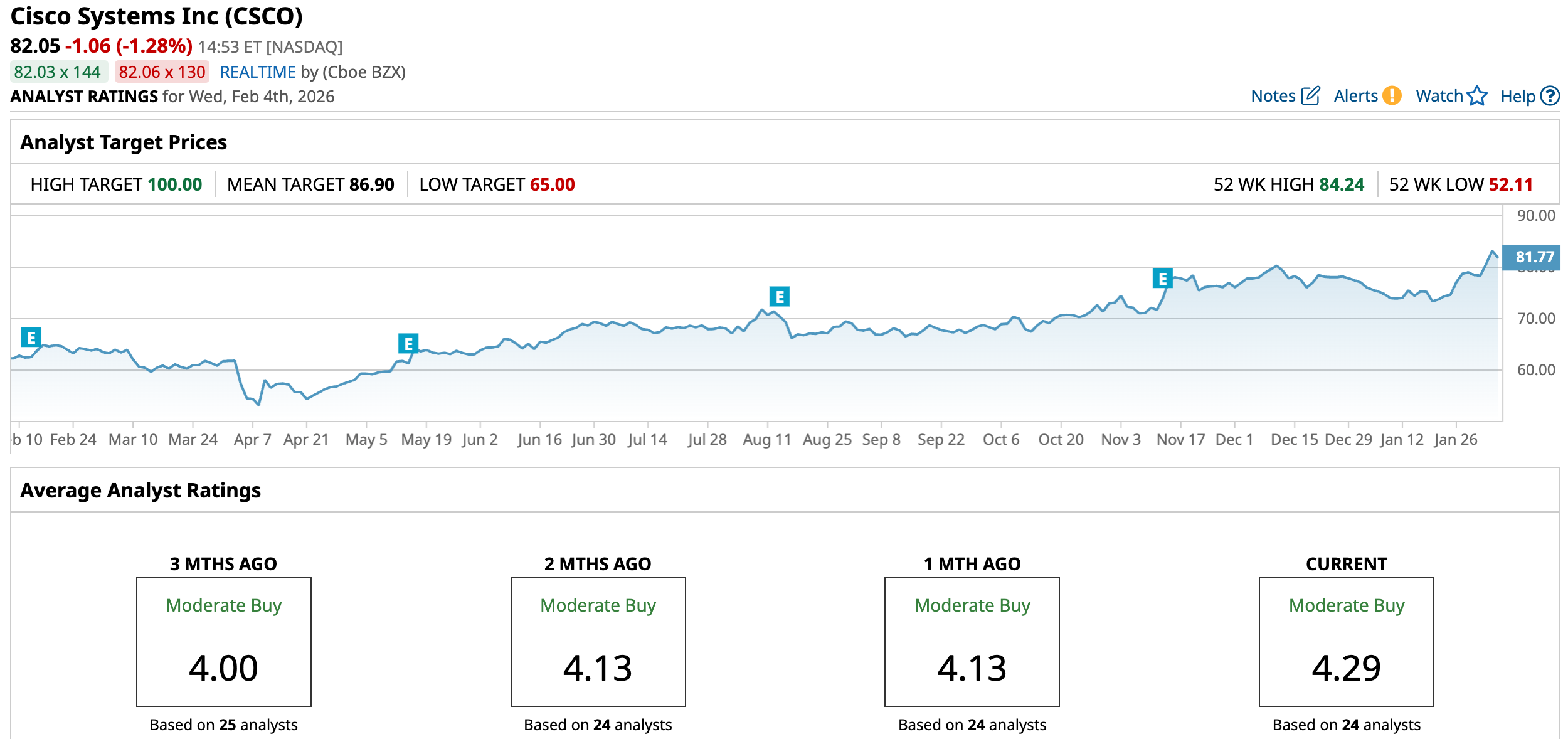 Nevertheless, its shares reached an almost 20-year high on Feb. 1 and followed with a fresh 52-week high today of $84.24, supported by enterprise network refresh cycles and rising investment in AI-ready infrastructure.