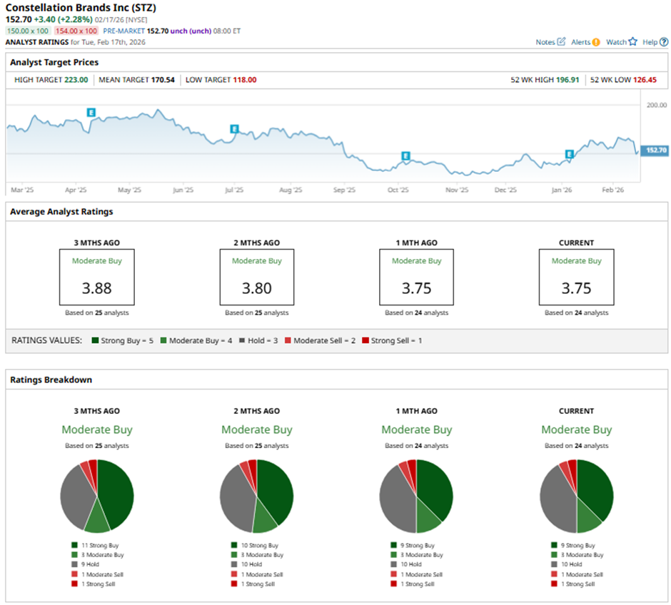 The mean price target of $170.54 represents a premium of 11.7% to STZ’s current levels. The Street-high price target of $223 implies a potential upside of 46% from the current price.