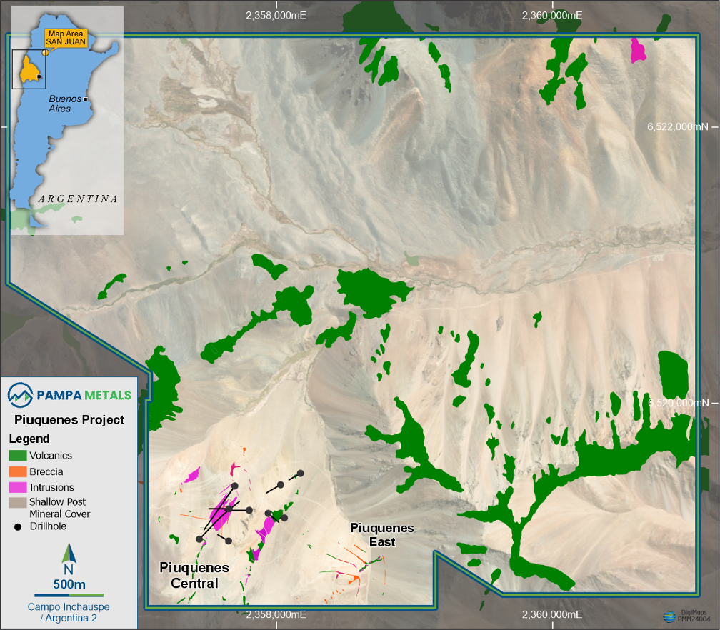 Joseph van den Elsen, Pampa Metals President and CEO commented: "We are very pleased with the rapid progress we are making at Piuquenes and are excited by the upcoming field season. The Piuquenes project is a Company making asset and we look forward to more fully delineating the size and grade potential of the first deposit during the 2024/25 field season and concurrently testing a second undrilled, outcropping porphyry at Piuquenes East. Desktop work to-date confirms the potential for a cluster of deposits and we will advance several other targets this field season through surface exploration and possibly geophysics."