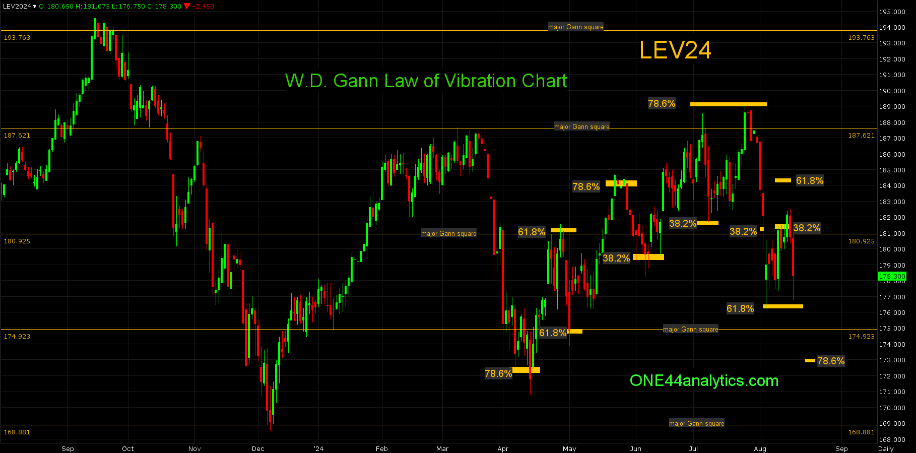 The low on 4/12/24 had one close below 78.6% of the 12/7/23 low and 3/21/23 low at 172.50, ( we always want to see two to violate the level), if we follow the ONE44 78.6% rule the target is 78.6% the other way and this was 184.00, this was achieved on 5/22/24.