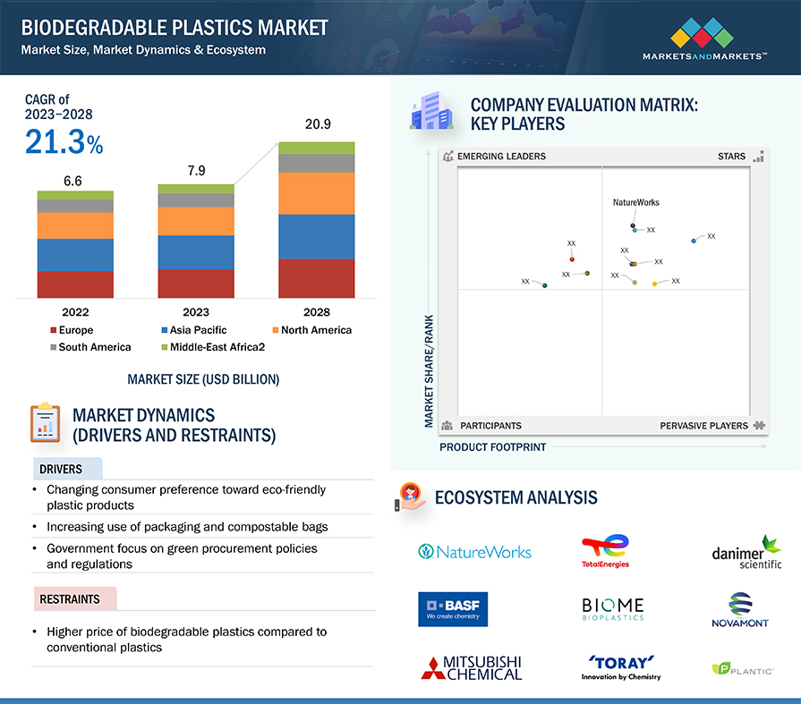 The global biodegradable plastic market is projected to reach USD 20.9 billion by 2028, at a CAGR of 21.3% from USD 7.9 billion in 2023. Environmental awareness, regulatory frameworks, circular economy initiatives, corporate sustainability goals, consumer preferences, and technological advancements are driving the market.