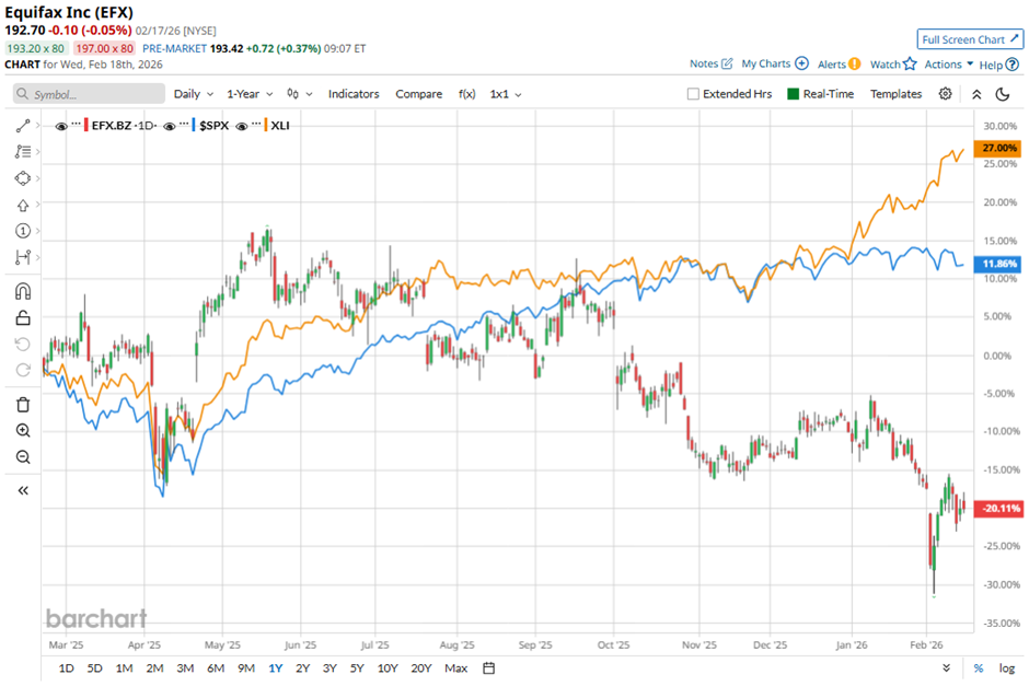Shares of the credit reporting company have underperformed the broader market over the past 52 weeks. EFX stock has decreased 21.4% over this time frame, while the broader S&P 500 Index ($SPX) has rallied 11.9%. Moreover, shares of the company are down 10.6%, compared to SPX's marginal decline.