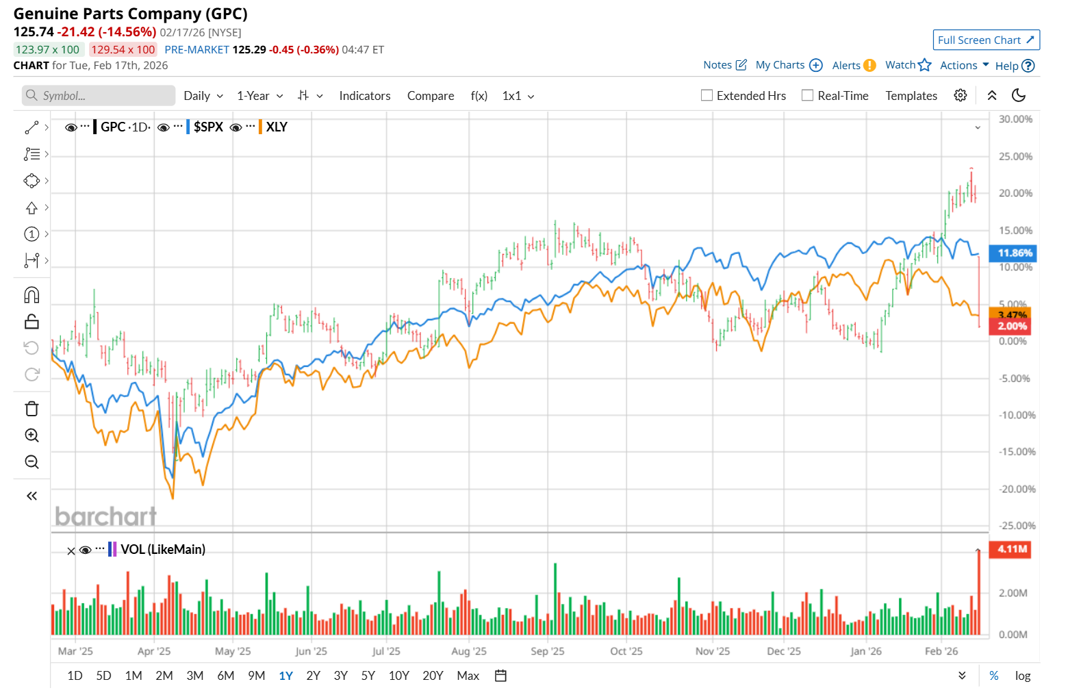 On Feb. 17, shares of GPC tumbled 14.6% after delivering weaker-than-expected Q4 earnings results. Its total revenue rose 4.1% year over year to $6 billion, supported by higher comparable sales and contributions from acquisitions, but still came in slightly below analysts’ estimates. Softer comparable sales in the international automotive segment likely weighed on the top-line performance. On the profitability front, its adjusted EPS fell 3.7% from the prior-year quarter to $1.55, primarily due to lower EBITDA in both the North America and international automotive segments. The figure missed consensus expectations by a notable margin of 13.4%, further pressuring the stock.