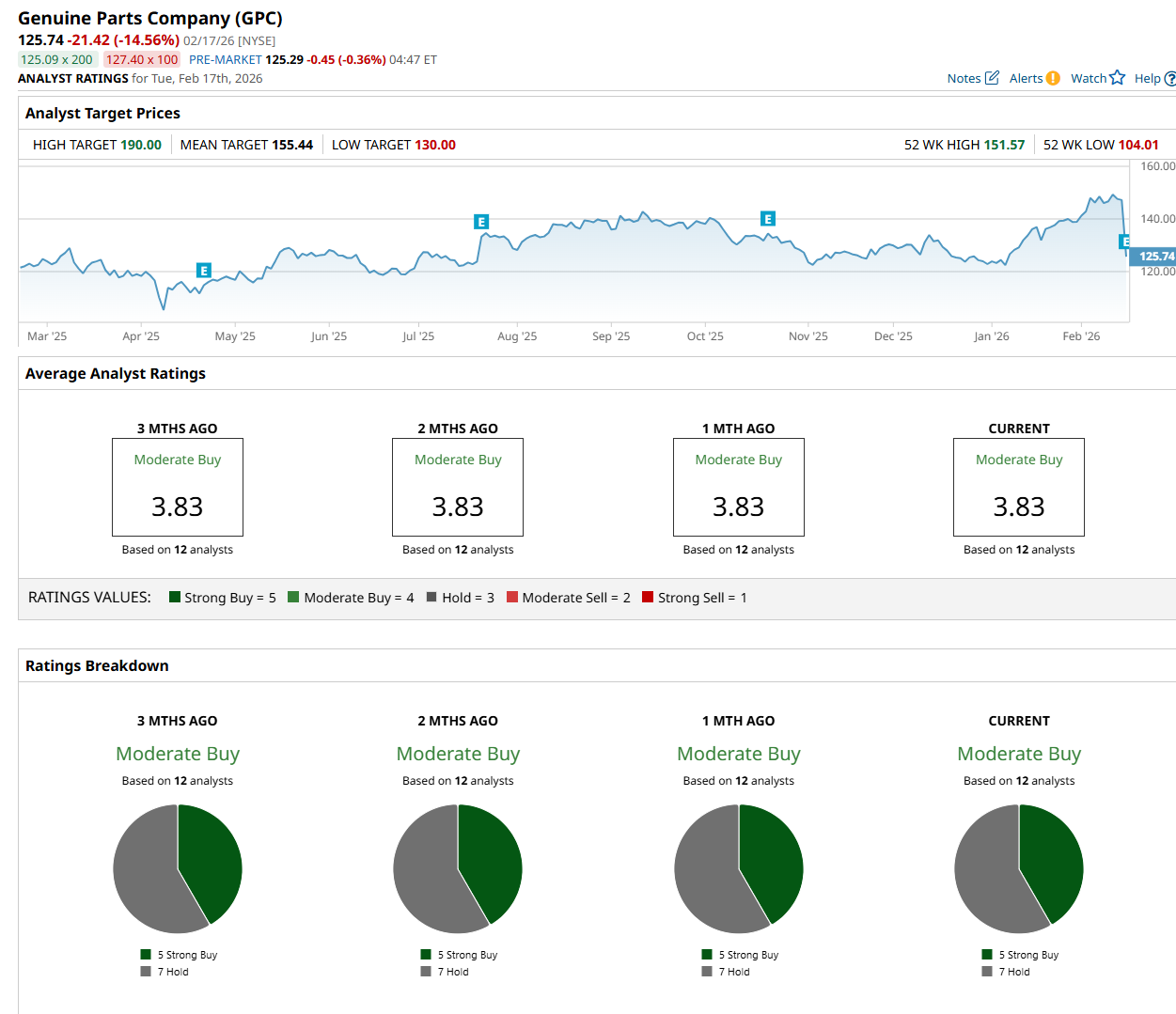 On Feb. 12, Truist Financial Corporation (TFC) maintained a "Buy" rating on GPC and raised its price target to $162, indicating a 28.8% potential upside from the current levels.