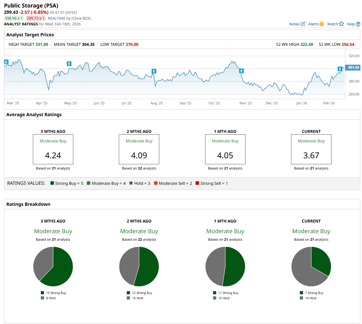 On Feb. 17, Evercore Inc. (EVR) maintained an "In Line" rating on PSA but lowered its price target to $302, indicating a marginal potential upside from the current levels.