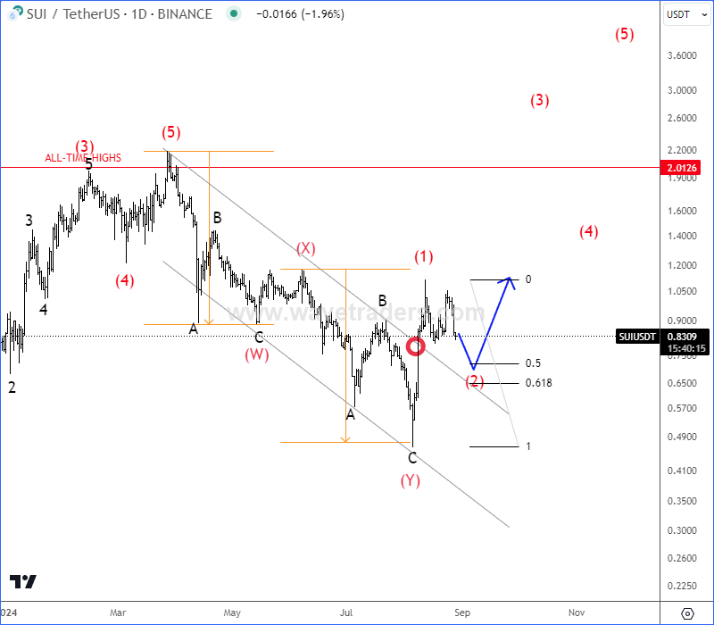 Cryptocurrency SUI with ticker SUIUSD looks promising from technical perspective and by Elliott wave theory. After it broke all-time highs in an impulsive five-wave fashion at the beginning of 2024, we have seen a corrective decline that looks like a completed complex W-X-Y correction, especially if we consider current strong rebound back above channel resistance line. So, SUI can be actually back to bullish mode, but more gains can be expected after current wave (2) pullback, which can retest 0.80 – 0.60 support zone before a bullish resumption into wave (3) of a five-wave bullish cycle towards new all-time highs.