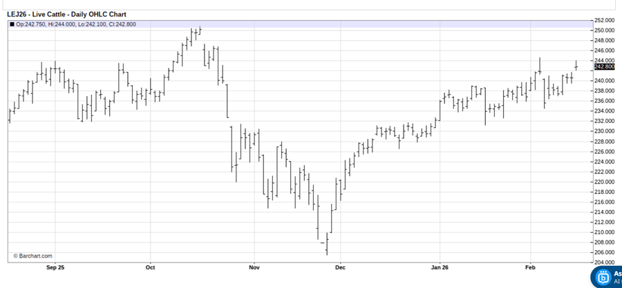 April live cattle (LEJ26) futures present a buying opportunity on more price strength.