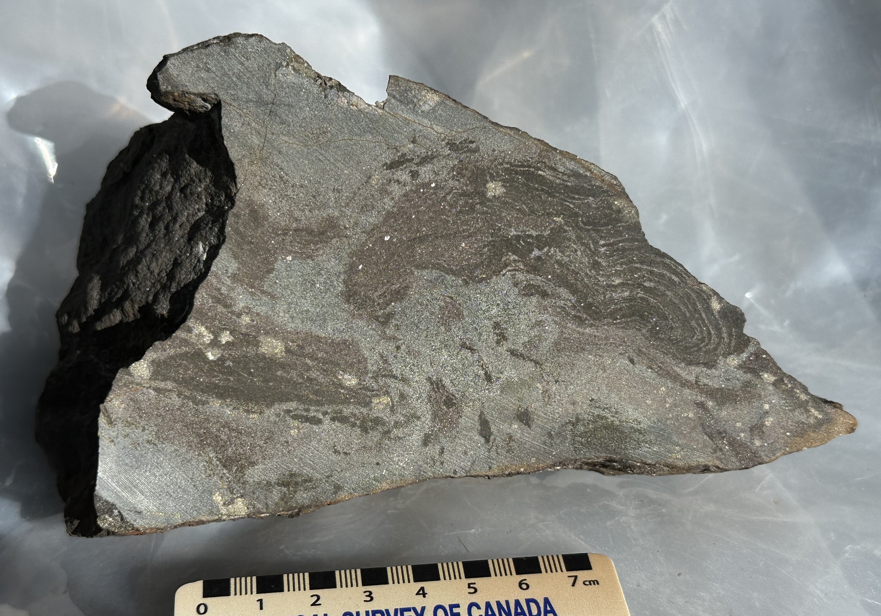 Photo B - Sample STM-23-1 (6.71% zinc, 2.23% lead, 16.05 g/t silver, 1258.9 ppm or 0.12% copper) Strongly magnetic boulder found in talus at base of the moutnain slope late last year. Sphalerite (zinc sulphide), galena (lead sulphide), and iron sulphides (pyrite, pyrrhotite) occur banded or bedded in appearance as seen above. The mineralisation also occurs in the groundmass of the rock.