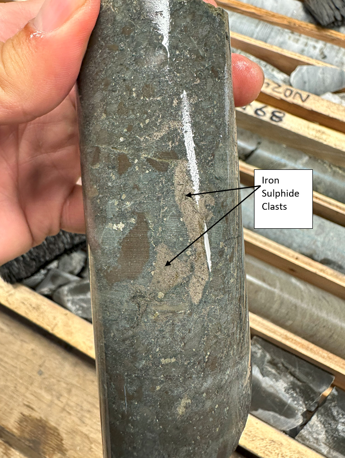 Photo A - Fragmental unit with iron sulphide (pyrrhotite and pyrite) in the matrix and what appear to be iron sulphide clasts in places. Zinc sulphide (sphalerite) and copper sulphide (chalcopyrite) are locally visible in trace amounts (samples have been sent for analysis).
