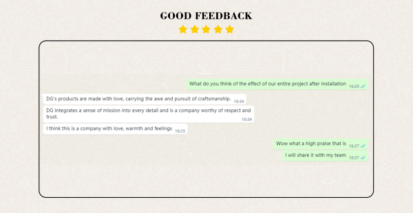 DG demonstrated its effectiveness during installation by finishing the job ahead of schedule and completely revamping the store in just six days, which was initially supposed to take 15 days. The client's feedback was highly positive, praising DG's professionalism and artistry. "DG's products are made with love, carrying a deep respect for craftsmanship," said one satisfied customer. “They are a business deserving of respect and trust since they have infused their mission into every aspect of their operations.”