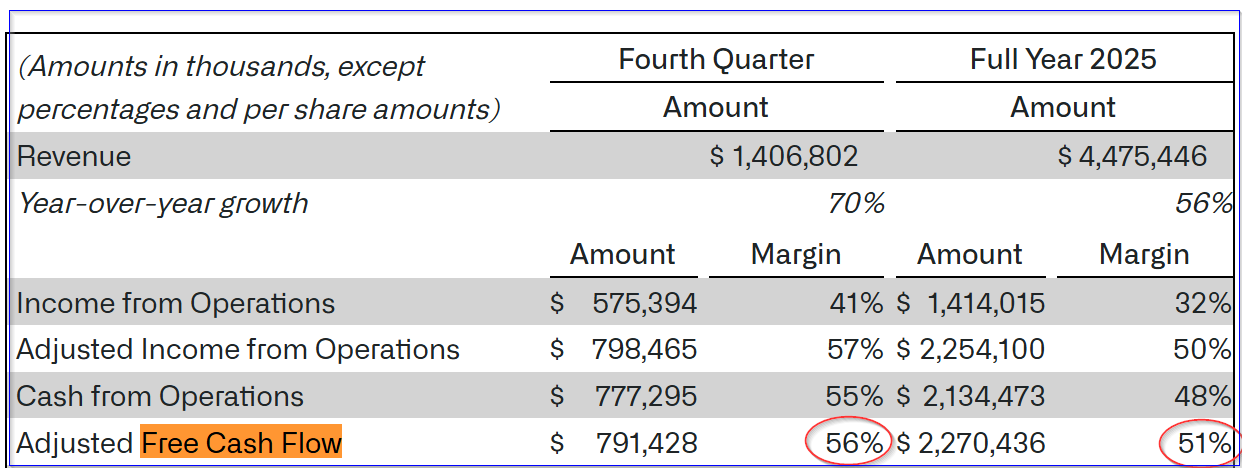 Palantir is one of the very few companies that emphasizes its FCF margins. The company reported that its free cash flow, on an adjusted basis, represented 56% of its Q4 revenue. And for 2025, it was 51%.