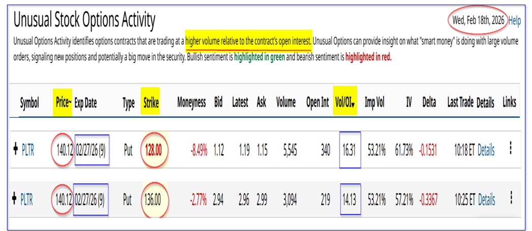 It shows that over 5,500 put option contracts have traded at the $128.00 strike price and almost 3,100 puts at the $136.00 strike price, both expiring in 9 days on Feb. 27.
