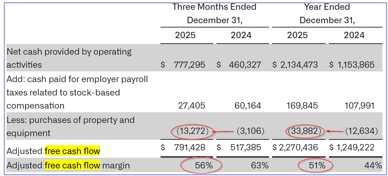 Second, this 56.7% adj. FCF margin is 11% over than the 51% adj. FCF margin in 2025. In other words, even as revenue is expected to rise over 60% in 2025, it will squeeze out even more cash from operations, as the adj. FCF is expected to rise 77%.