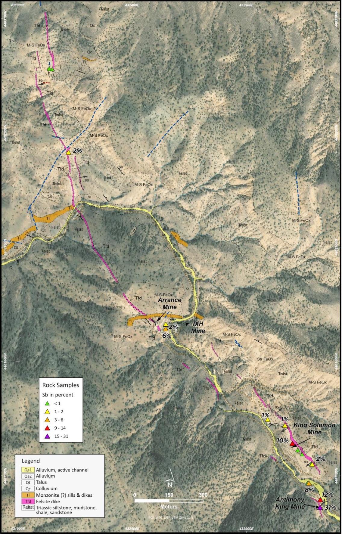 Bernice Canyon, which spans the property from northwest to southeast over several kilometers, features a series of historical antimony mines on both sides. A total of twenty-one samples were collected from dumps and stockpiles scattered along the canyon floor, along with several exposures of the felsite dike complex itself. Antimony values range from 98 ppm to 30.9% Sb; in general, antimony values correlate with the sample's visible stibnite. Five grab samples of the spread-out, spheroidal stibnite hosted in the QSP-altered felsite had Sb values ranging from 0.24 to 2.45%. This style of mineralization appears to be volumetrically more important than the higher-grade vein-type occurrences. We collected four grab samples of felsite-hosted stibnite-rich veins; the Sb values ranged from 5.69-12.03%. A pile of mostly vein-type minerals, composed of milky-white quartz and ankerite/iron oxides, had the highest value of 30.89% Sb.