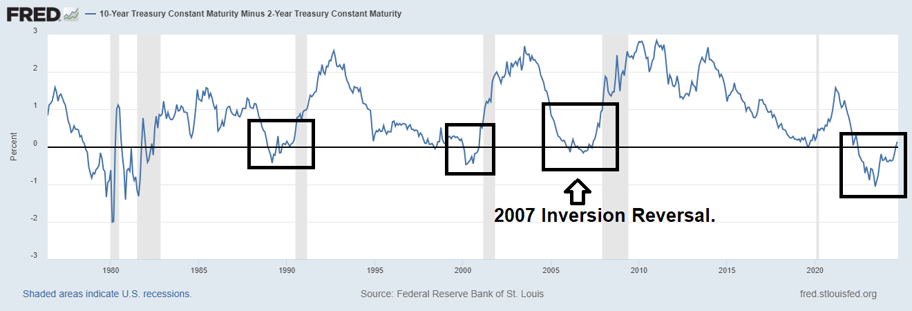 • A prolonged yield curve inversion was uninverted in the summer of 2007. We've also seen a prolonged yield curve inversion go positive in the summer of 2024. This chart depicts this occurrence in 2007; the blue line represents the spread between the 10-year and 2-year note Treasuries. When the spread goes negative (below the black line), it is said to be inverted. This has historically been a precursor to recessions (grey bars), but the recession often comes months after the curve moves back into positive territory. Will this time be different? It isn't likely.