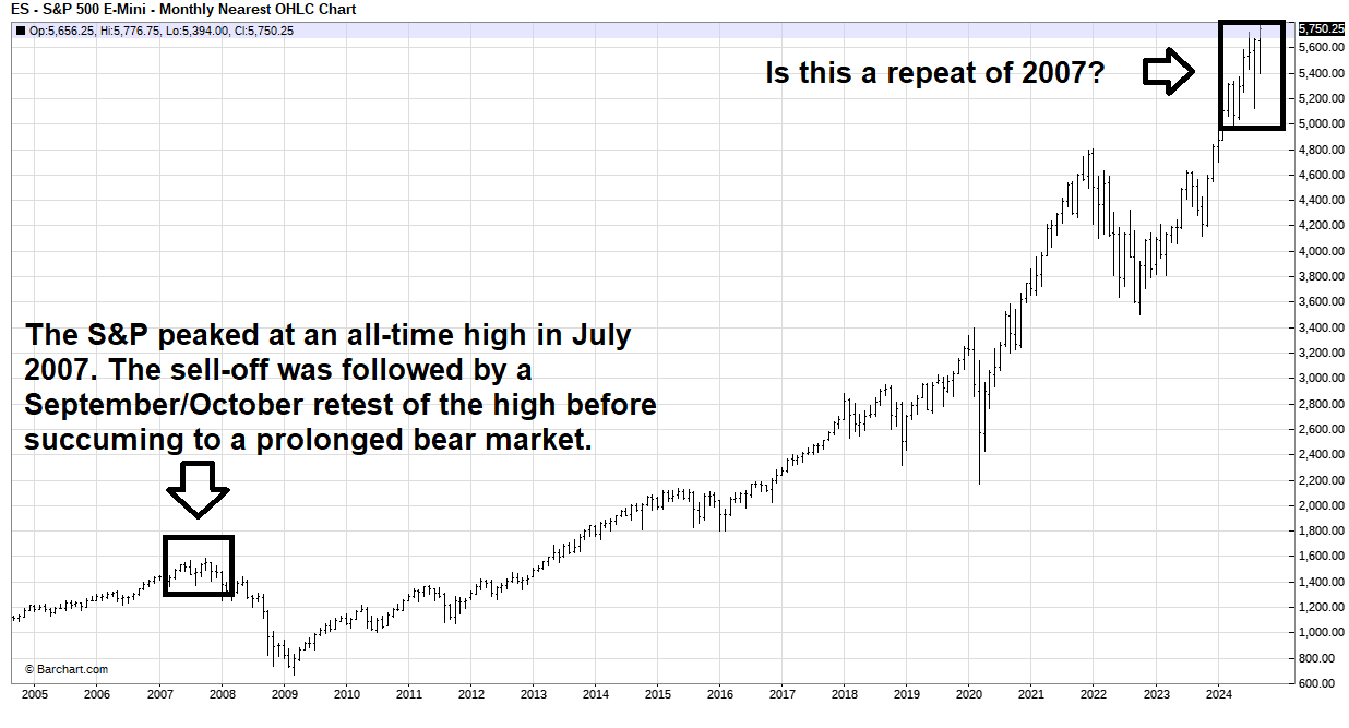 • The S&P posted a high print in July 2007, followed by a September/October recovery that fell short and succumbed to selling. Is this what we are seeing now?